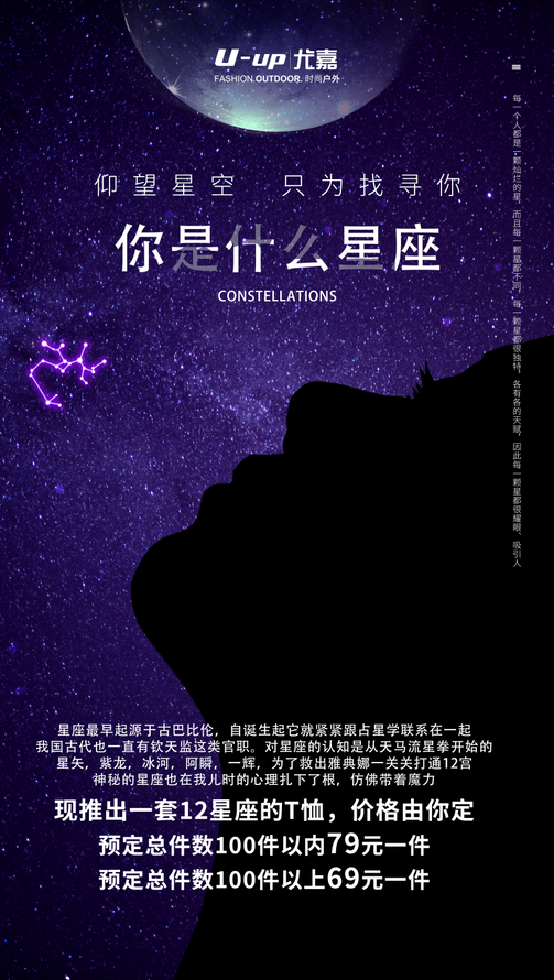 星座最早起源于古巴比伦,自诞生起它就紧紧的跟占星学联系在一起,我国古代也一直有钦天监这类官职。我的记忆里对星座的认知是从天马流星拳开始的,这是属于80后的回忆,星矢,紫龙,冰河,阿瞬,一辉,为了救出雅典娜一关关打通12宫。神秘的星座也在我儿时的心理扎下了根,仿佛带着魔力。经过多次沟通协商,公司终于推出一套12星座的T恤,价格有你们决定,预定总件数100件以内 79元一件,预定总件数100件以后69元一件。
