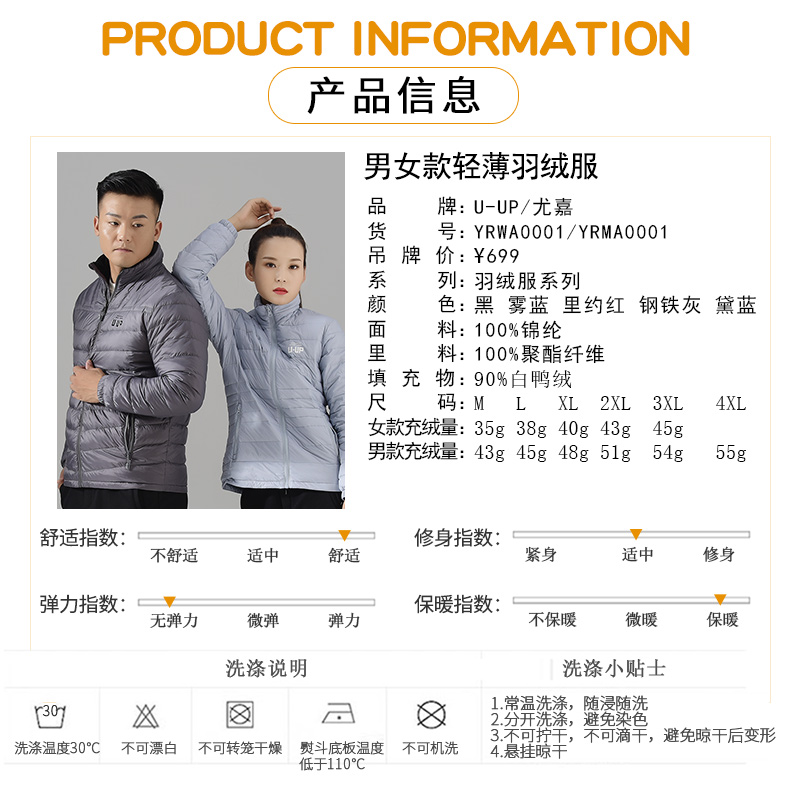 尤嘉(U-up)情侣款轻薄羽绒服YRMA0001YRWA0001